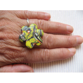 RING flower, multicolored cabochon on yellow background in Fimo