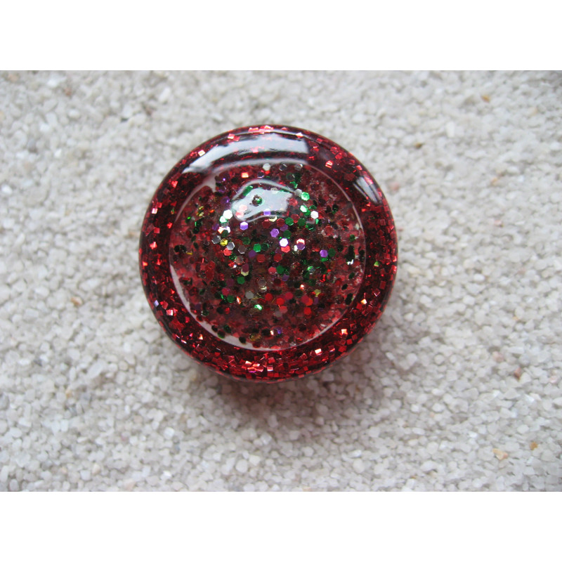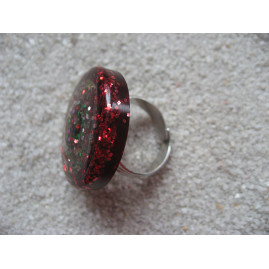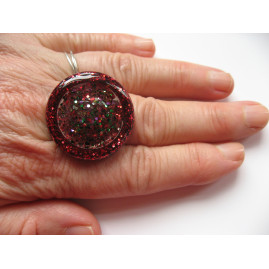 Graphic RING, multicolored glitter cabochon, on a red resin background