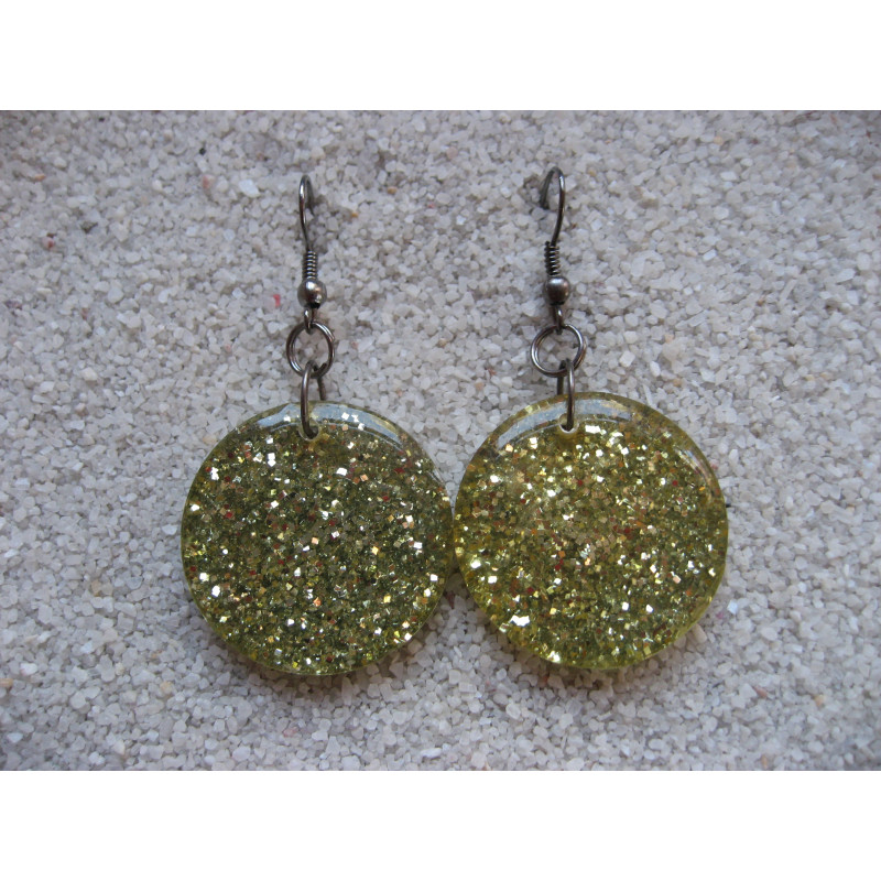 Flat earrings, silver glitter, in resin