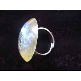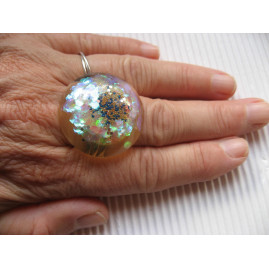 Large cabochon ring, blue microbeads / fuchsia, resin