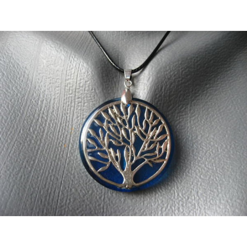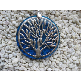 Pendentif Zen arbre de vie argenté sur fond bleu en résine