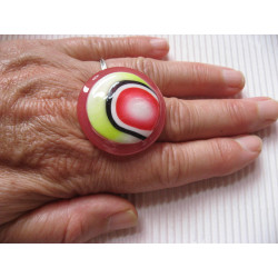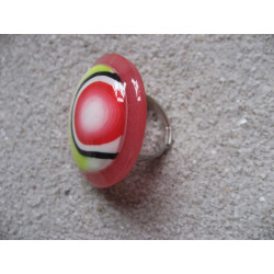 Grande bague cabochon géométrique en fimo sur fond rouge nacré en résine