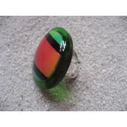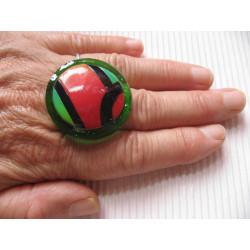 Grande bague cabochon géométrique en Fimo sur fond vert en résine