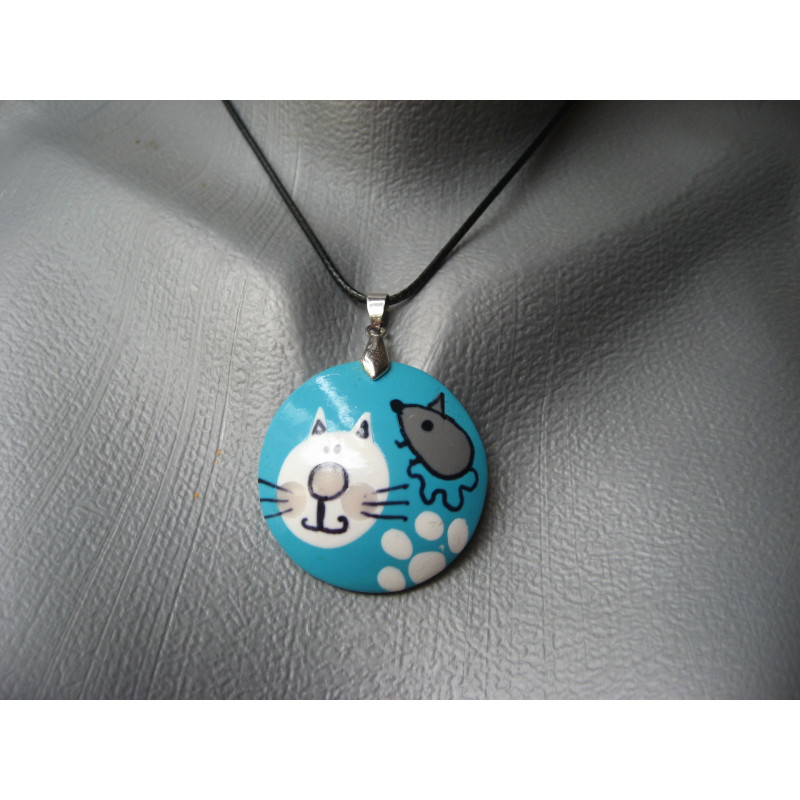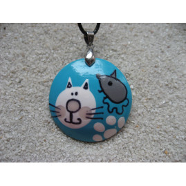 Pendentif cabochon chat et souris sur fond turquoise en fimo