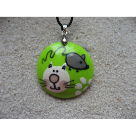 Pendentif cabochon chat et souris sur fond vert en fimo