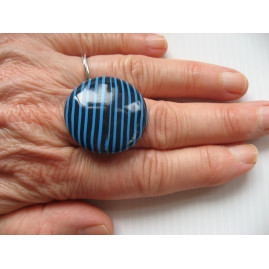 Grande bague cabochon rayé noir et bleu en fimo
