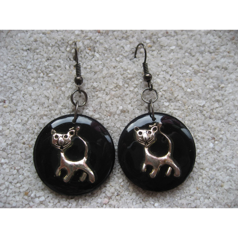 Boucles d'oreilles chat argenté sur fond noir en résine