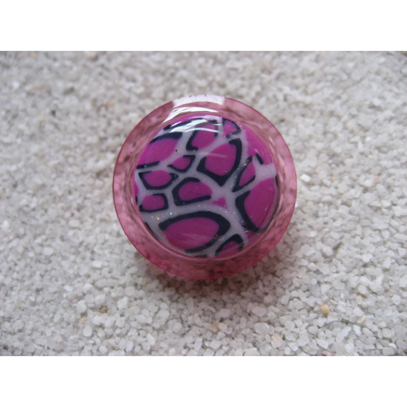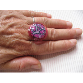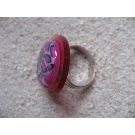 Petite bague ajustable cabochon marbré fuchsia en fimo sur fond rose en résine