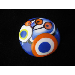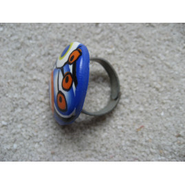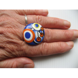 Bague cabochon motifs multicolores sur fond bleu en Fimo