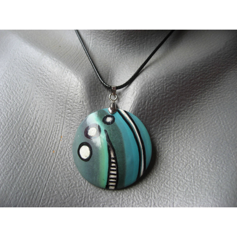 Pendentif motifs noirs et blancs sur fond turquoise en Fimo