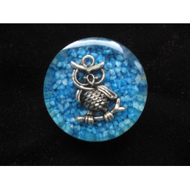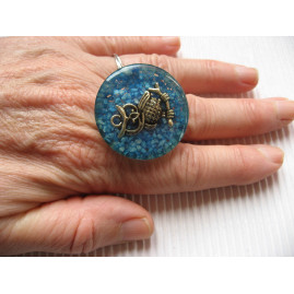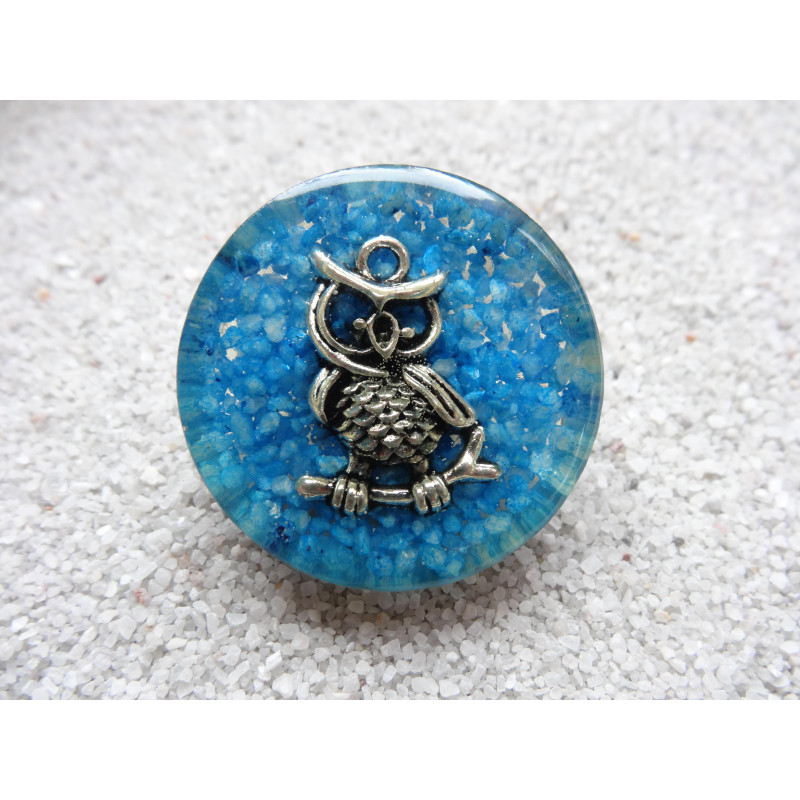 Grande bague estampe argentée hibou sur fond turquoise en résine