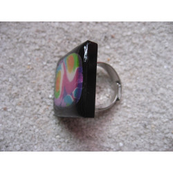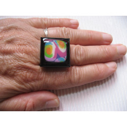 Petite bague carrée cabochon multicolore en fimo sur fond noir en résine