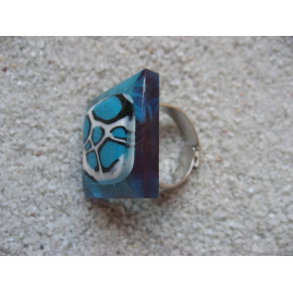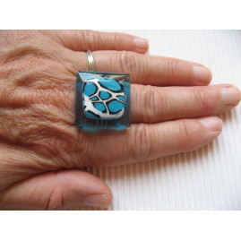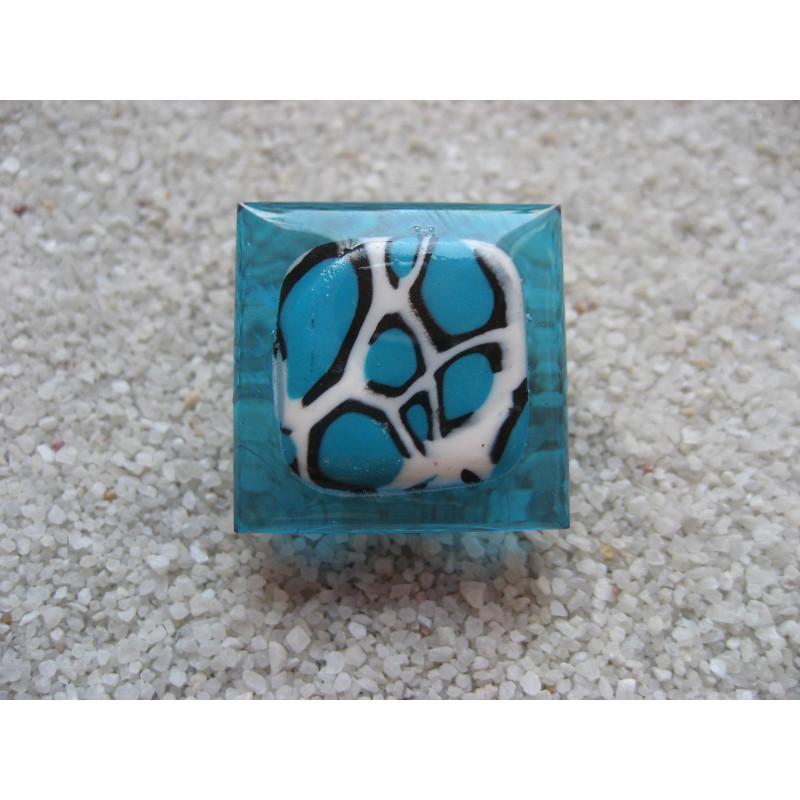 Bague carrée cabochon marbré turquoise et blanc en fimo sur fond bleu en résine en résine