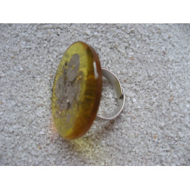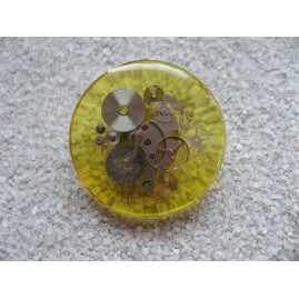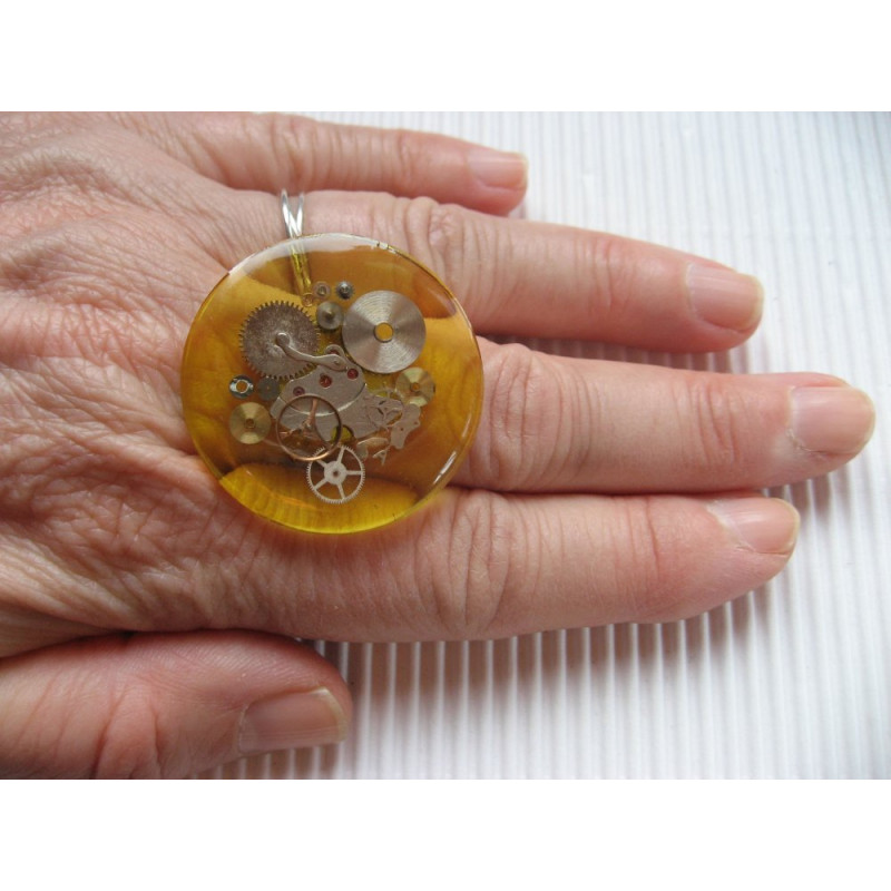 Grande bague Steampunk les rouages du temps sur fond jaune en résine
