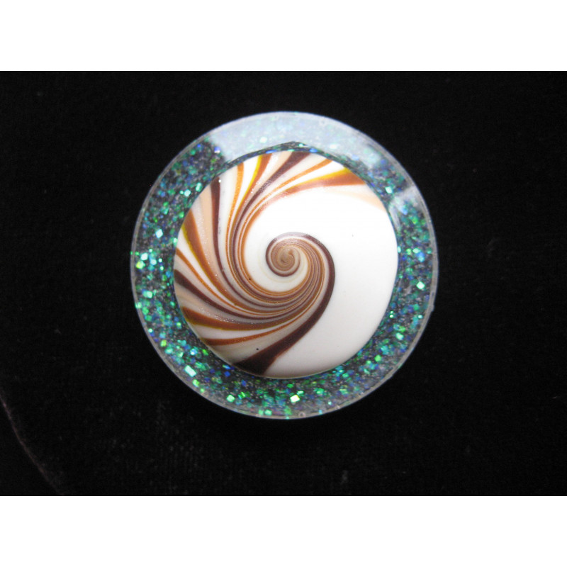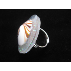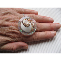 Grande bague spirale marron et beige en fimo sur fond blanc nacré en résine