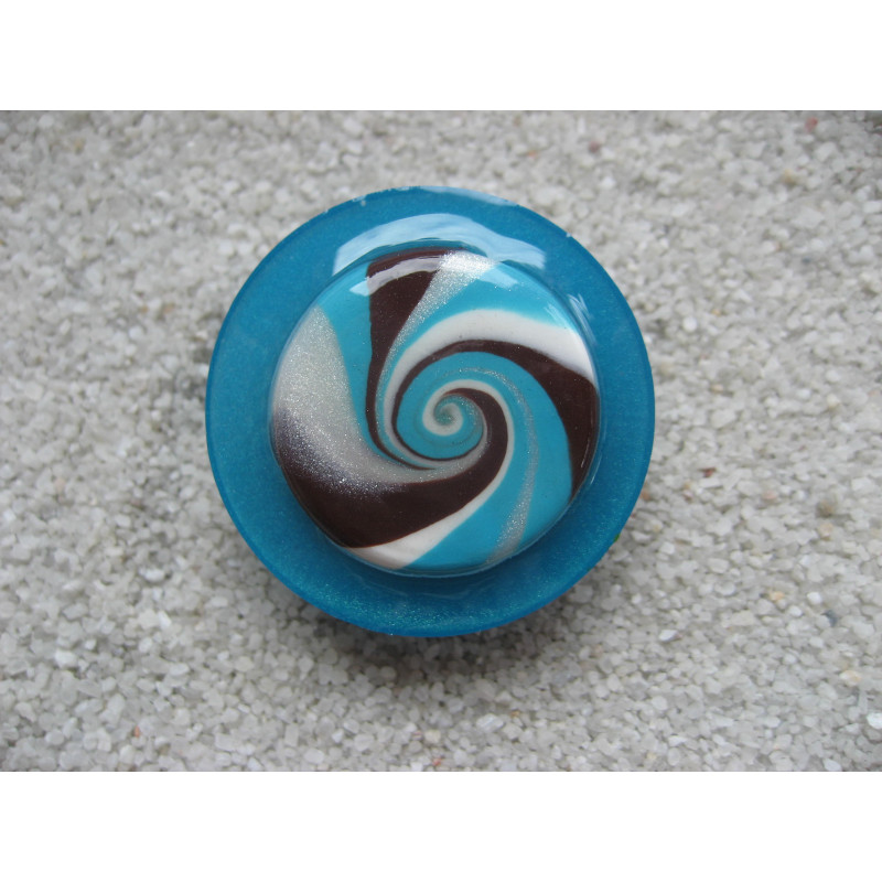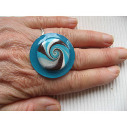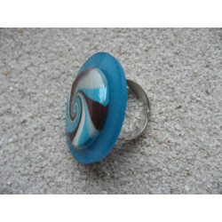 Grande bague spirale turquoise et marron en fimo sur fond bleu en résine