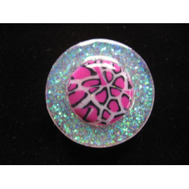Grande bague graphique, cabochon fimo fuchsia, sur fond blanc nacré en résine