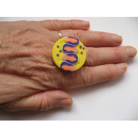 Grande bague motifs oranges et prunes sur fond jaune en Fimo