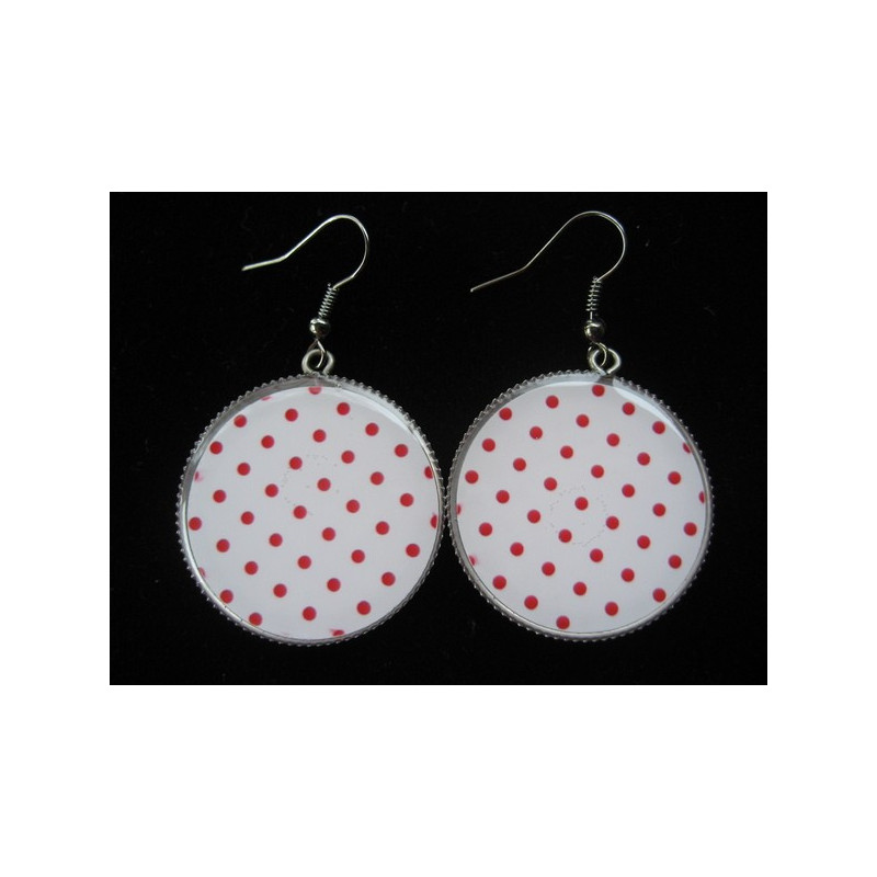 Boucles d'oreilles pois rouges sur fond beige serties en résine