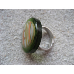 Bague cabochon rayé en fimo sur fond vert en résine