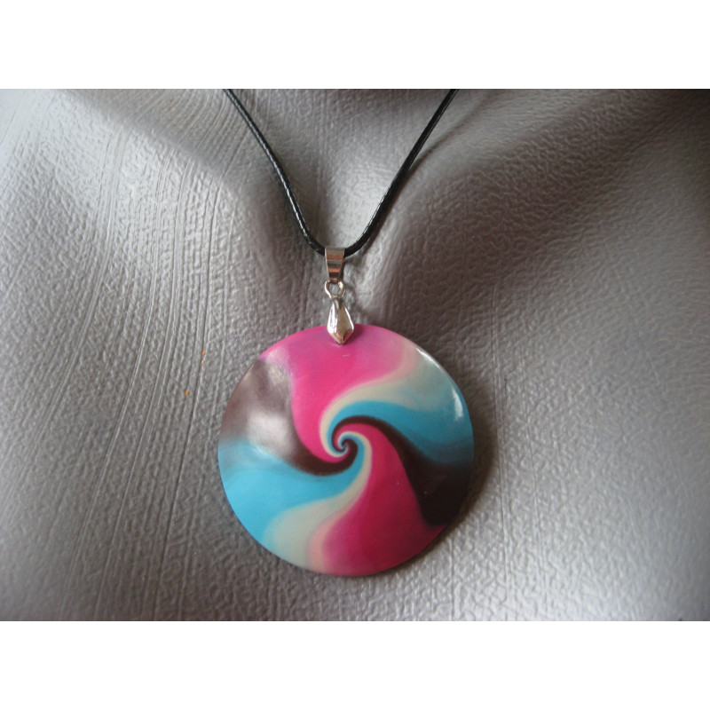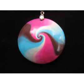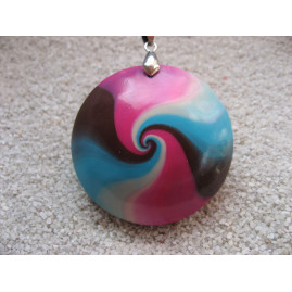 Grand pendentif cabochon unisexe spirale fuchsia turquoise marron en Fimo