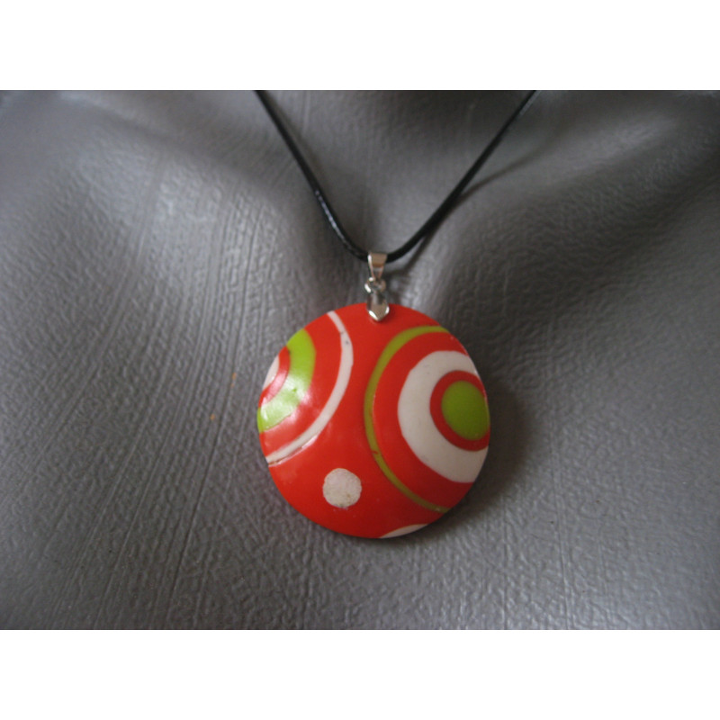 Pendentif graphique cabochon blanc et vert sur fond orange en Fimo