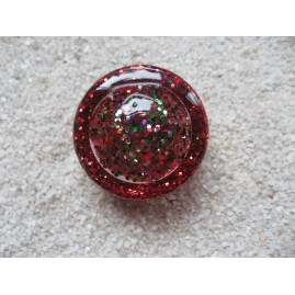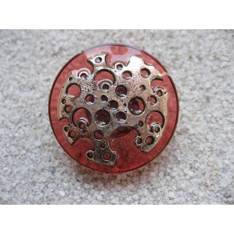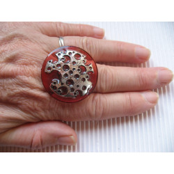 Grande bague, estampe trouée argentée, sur fond rouge en résine