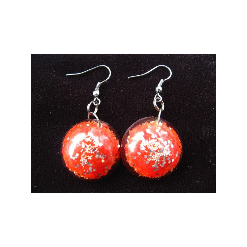 Boucles d'oreilles cabochon paillettes argentées sur fond rouge en résine