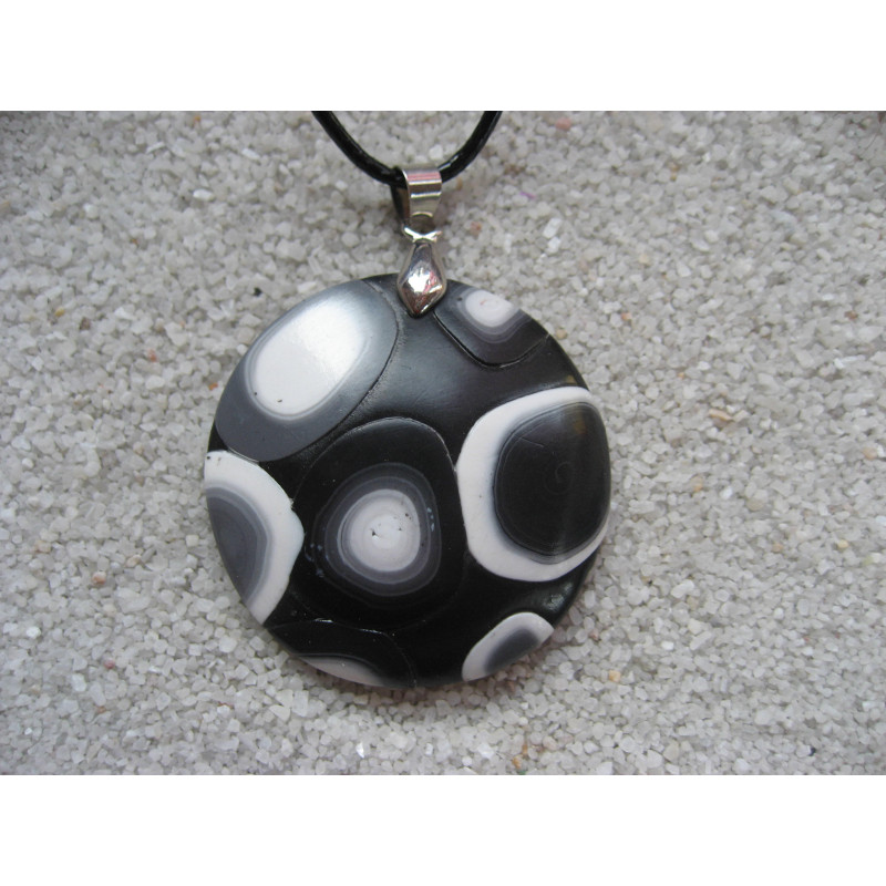 Pendentif cabochon motifs noirs et blancs sur fond noir en fimo
