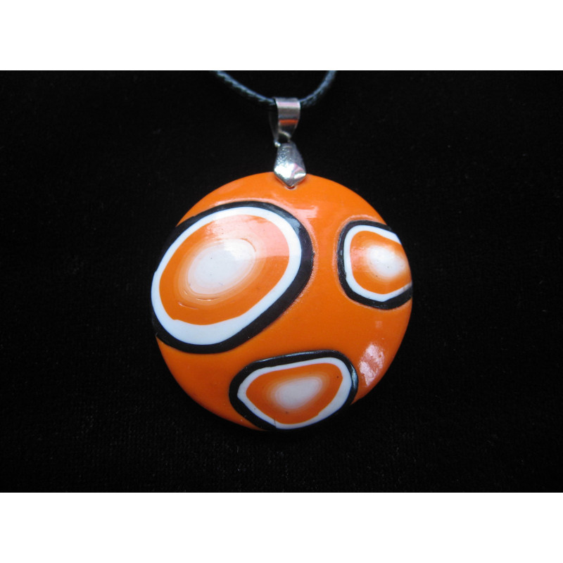 Pendentif motifs noirs et blancs sur fond orange en fimo