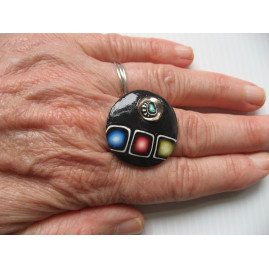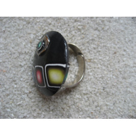Grande bague motifs multicolores sur fond noir en fimo