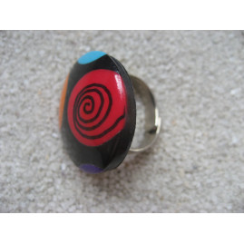 Bague cabochon motifs orange et rouge sur fond noir en fimo