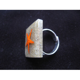 Bague carrée étoile de mer orange sur fond de sable en résine