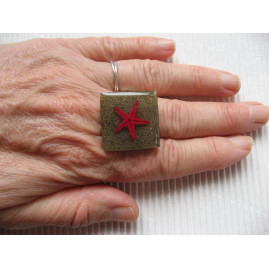 Bague carrée étoile de mer rouge sur fond de sable en résine